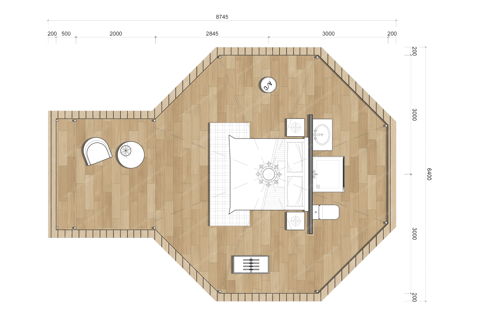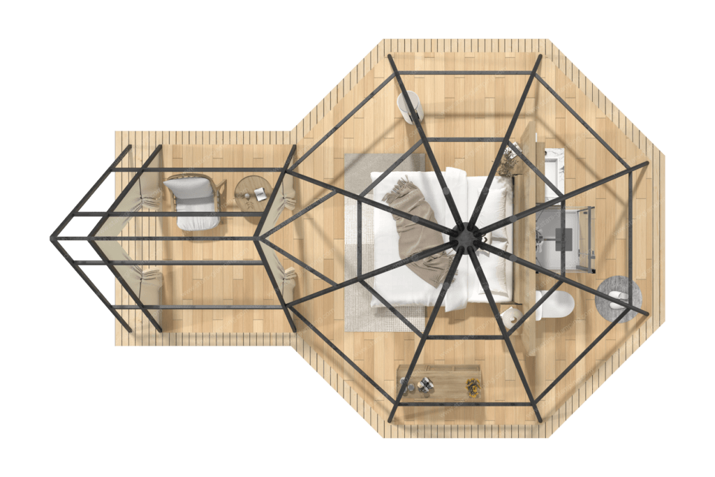 Stars Glamping’s designers have taken inspiration from the traditional and original Indian tents and applied the scientific concept of modern tents to research and design the new Safari Tent – Teepee. Compared to the original Indian tent, the Safari Tent – Teepee has a triangular space at the front door as a living room or a space for activities.