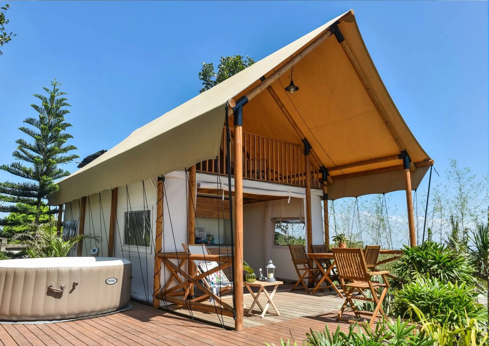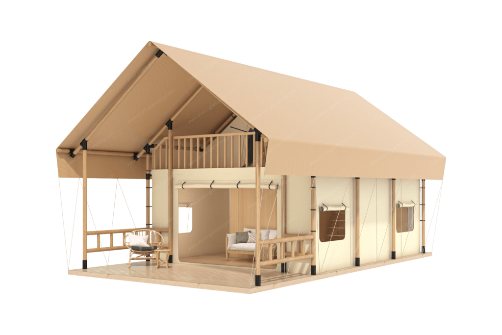 خيمة سفاري فاخرة - لوفت هي خيمة تخييم جديدة وشعبية للغاية. توفر خيمة السفاري الفاخرة لدينا تجربة معيشة أكثر راحة وفخامة. حجم خيمة السفاري العلوية لدينا هو 5x9 م. يستخدم الغطاء الخارجي بوليستر مطلي بـ 850 جم/متر مربع من مادة PVC، وهو مقاوم للحريق، ومقاوم للماء 100%، ومقاوم للأشعة فوق البنفسجية، ومقاوم للتمزق، وقدرة على التنظيف الذاتي. والغطاء الداخلي يستخدم نسيج قماش أكسفورد 900D. تشتمل خيمة السفاري العلوية على هيكل إطار الطابق الثاني والسلالم، ولكنها لا تشمل الأرضيات الخشبية.