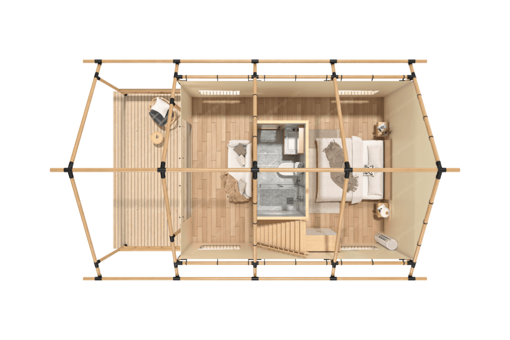 تتميز خيمة السفاري العلوية المتألقة في الهواء الطلق بالتأكيد برحابتها وراحة المعيشة. تصميم حديث وغرف نوم منفصلة وحمام مجهز بالكامل ومنطقة معيشة مركزية مع مطبخ ومنطقة لتناول الطعام تواجه الطبيعة. توجد في المنطقة المركزية أيضًا غرفة طعام تربط بشكل أنيق التراس الممتد.