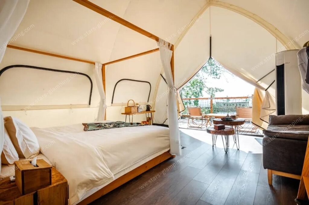 The Safari – Jupiter model takes inspiration from the sleek lines of sailing boats, featuring a sharply contoured roof and a dynamic silhouette that stands out while harmonizing with natural surroundings. Each tent is built on an elevated wooden deck, offering guests a private outdoor space to enjoy mountain breezes, sunlight, and the gentle sounds of nearby streams. As a leading tent manufacturer and tent factory in China, Stars Glamping customized the Jupiter tents using reinforced steel frames, high-strength membranes, and optional insulation layers to ensure stability and year-round comfort in Hunan’s variable climate.
