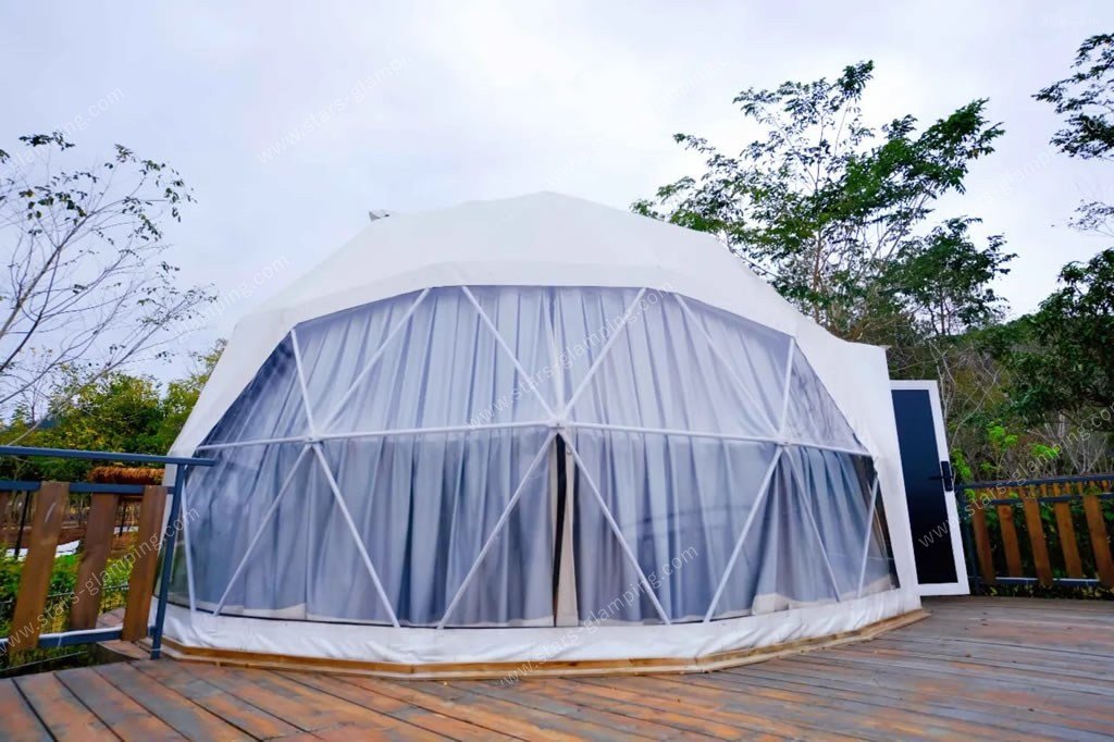 The PVC Dome Tent is known for its modern spherical shape and strong visual appeal. Its curved structure blends harmoniously with the vertical lines of the bamboo forest, creating a unique contrast between architecture and nature. As a professional tent manufacturer and tent factory, Stars Glamping customized the dome tents with durable PVC membranes, high-strength steel frames, and large panoramic windows to allow guests to enjoy sunlight, forest views, and starry nights.