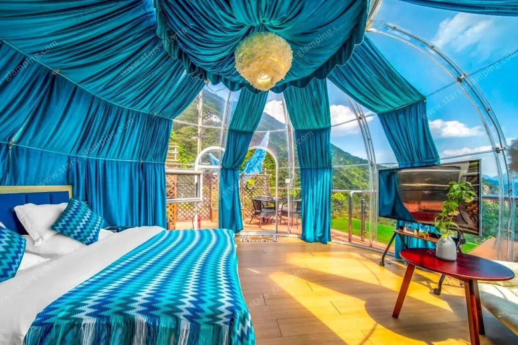The PC Dome model features a high-transparency polycarbonate shell combined with a strong structural frame, creating a panoramic “star room” effect. Guests can lie on the bed, open the top skylight, and admire the night sky, moonlight, and rolling mountain clouds from the comfort of their rooms.