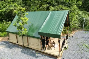Der Safari-Lodge-Zelt’s wooden structure and steel nodes used in the tent frame have been tested for durability. All we can do is to make our products blend in with nature, and the vagaries of nature are the best test of our quality of craftsmanship. The outer fabric of the lodge tent is PVC tarpaulin, which is flame retardant and mildew resistant to wind, frost and rain. The ventilation window design is not limited, and the built-in insulation cotton can make the interior like spring in all seasons.