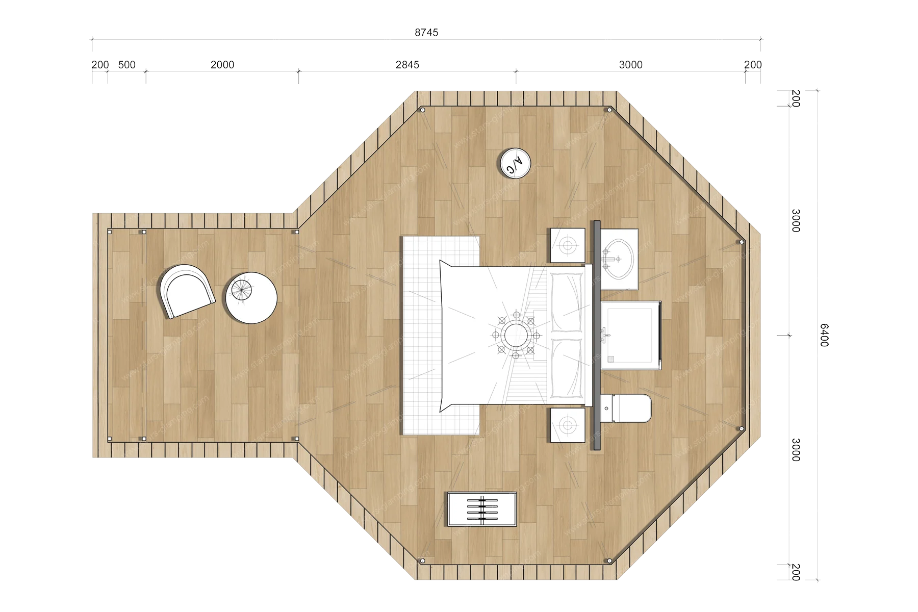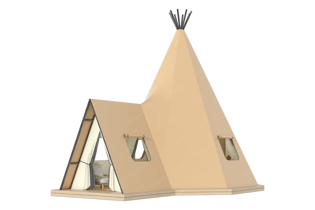 Die Designer von Stars Glamping haben sich von den traditionellen und ursprünglichen Indianerzelten inspirieren lassen und das wissenschaftliche Konzept moderner Zelte angewendet, um das neue Safarizelt – Tipi zu erforschen und zu entwerfen. Im Vergleich zum ursprünglichen Indianerzelt verfügt das Safarizelt – Tipi über einen dreieckigen Raum an der Vordertür, der als Wohnzimmer oder als Platz für Aktivitäten genutzt werden kann.