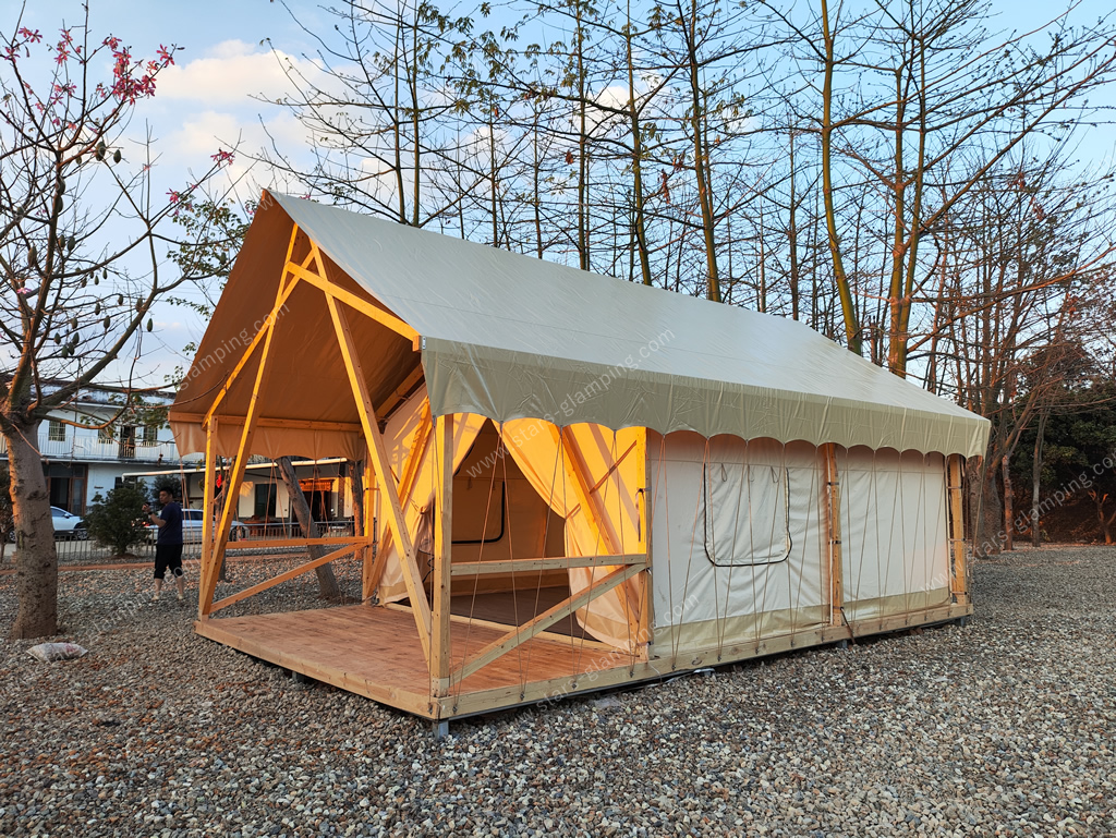 Glamping étoiles, a leading tent manufacturer and tent factory in China, completed a Tente Safari – Chalet glamping project in Huizhou. Surrounded by lush mountain scenery, this resort blends natural tranquility with modern comfort, offering an all-season luxury camping experience.