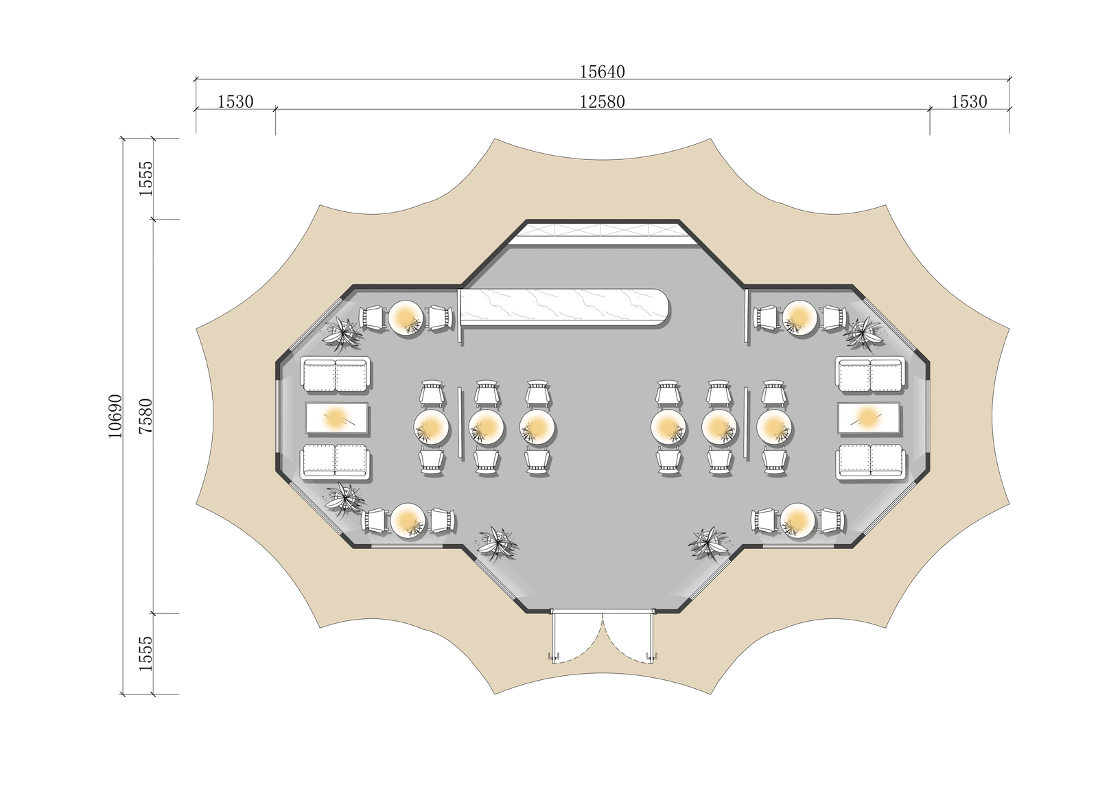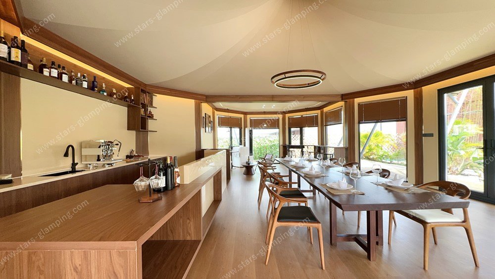 Inside, the spacious open-plan layout supports flexible zoning for dining, leisure, or customer service functions. Whether hosting guests, serving coffee, or organizing resort activities, the Cloud Tent offers a refined and functional space with premium finishes and hospitality-grade durability.