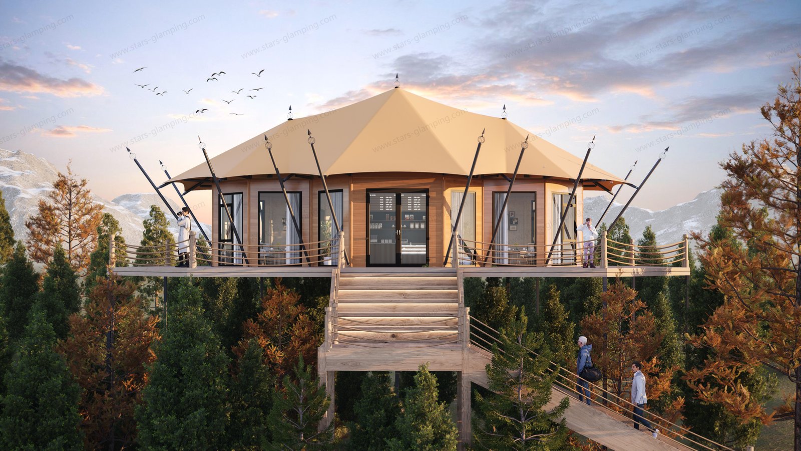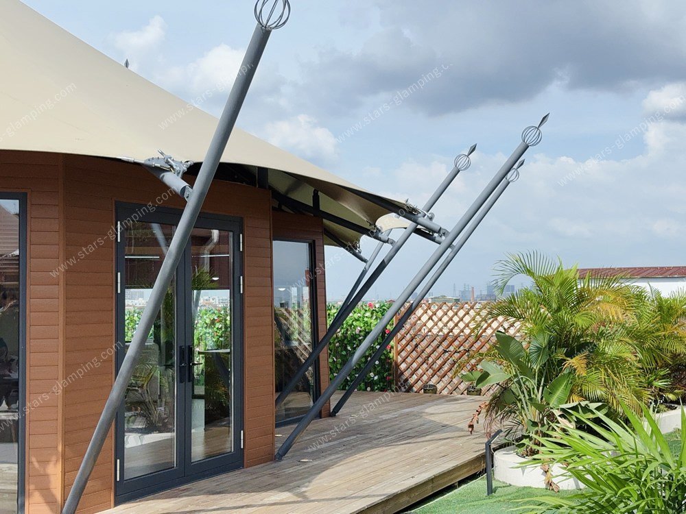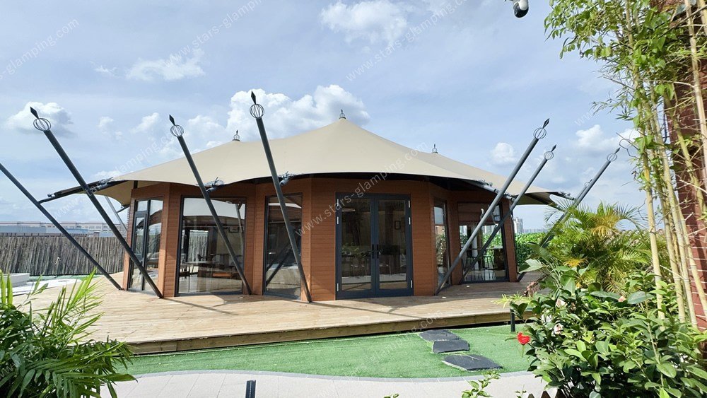Engineered with a dual-roof membrane system, this tent features a robust PVDF outer layer for weather resistance and a PVC inner lining for enhanced comfort. Together, they provide superior insulation, waterproofing, UV protection, and flame retardance – ensuring a year-round, all-weather experience. The aluminum alloy frame and bamboo details at the entrance add texture, warmth, and strength.