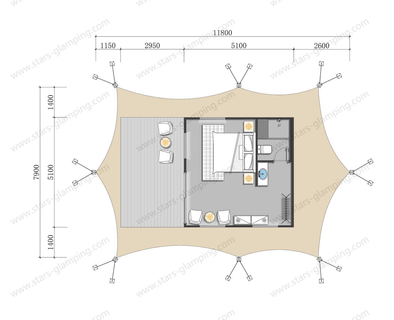 Our double-layer roof system creates an expansive 97m² shaded area, featuring a top-tier black mesh layer that blocks 99% of harmful UV rays while maintaining optimal airflow. This intelligent design keeps interiors cool and comfortable while significantly extending the tent’s lifespan. The spacious 5x5m interior can be configured as a versatile one-bedroom suite with an open living area and ensuite bathroom, providing guests with a luxurious five-star camping experience.