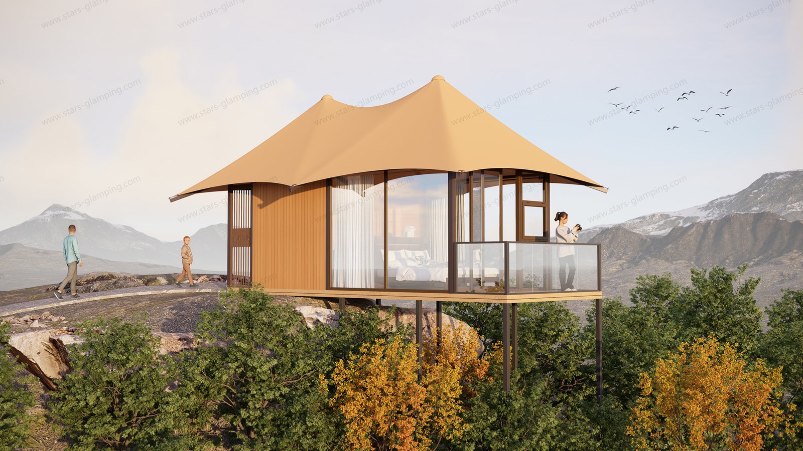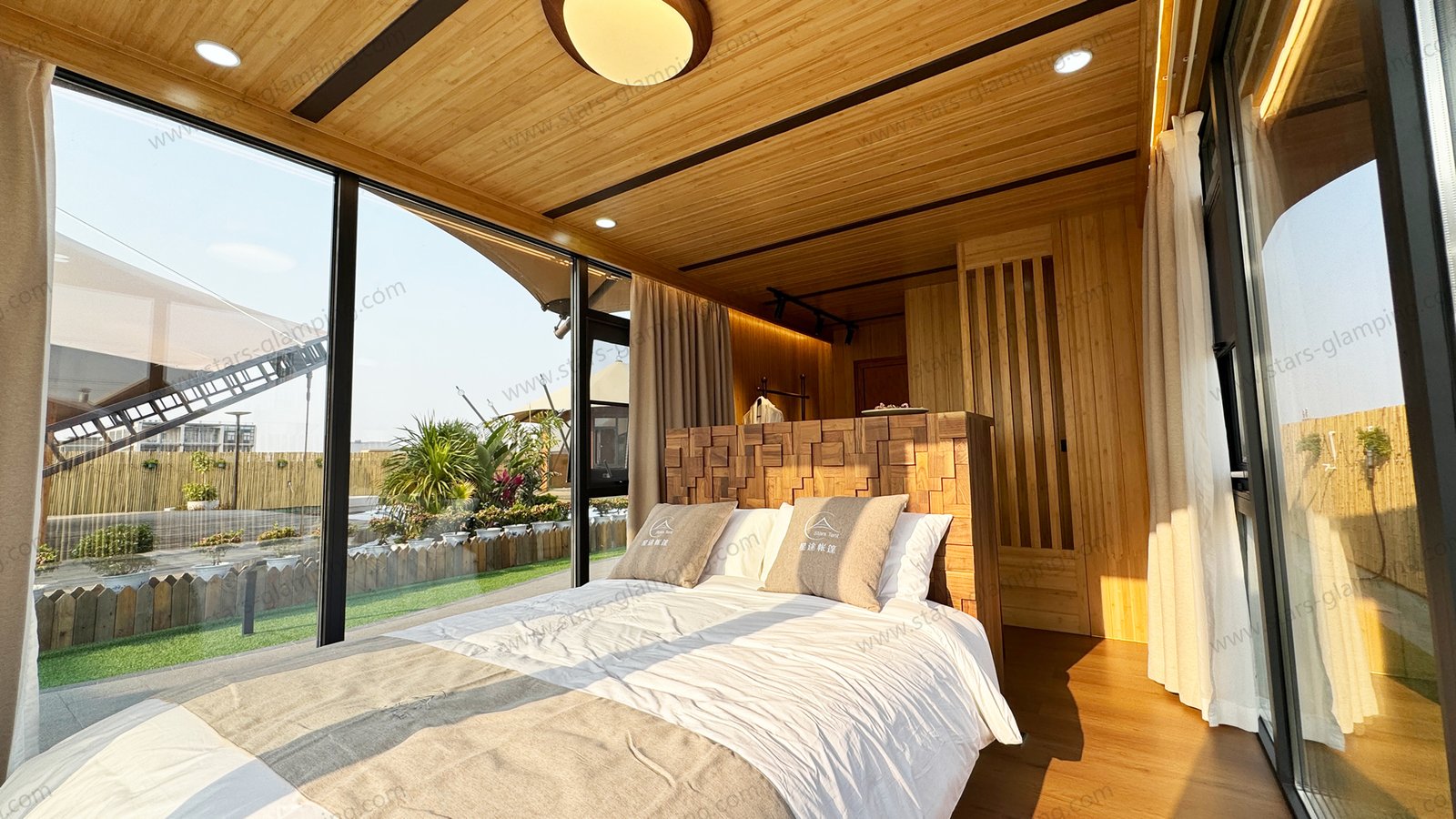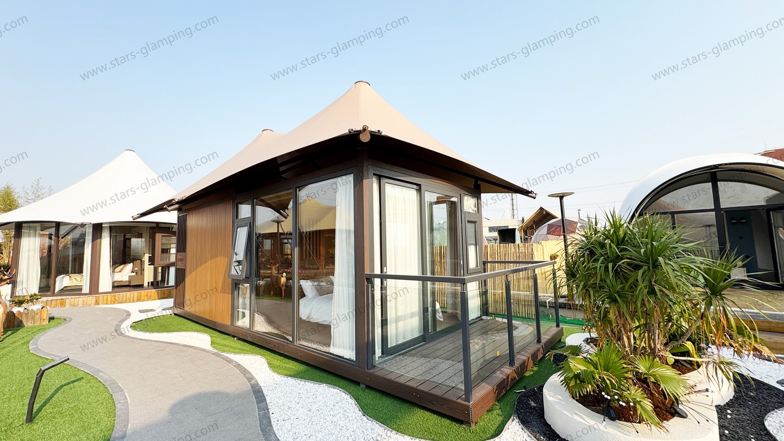 Constructed with a dual-layer roofing system – PVDF outer membrane and PVC inner lining – this luxury canvas tent provides excellent insulation, waterproofing, UV protection, and long-term durability. The tempered glass walls combined with a sturdy aluminum frame ensure strength, sound insulation, and guest privacy.