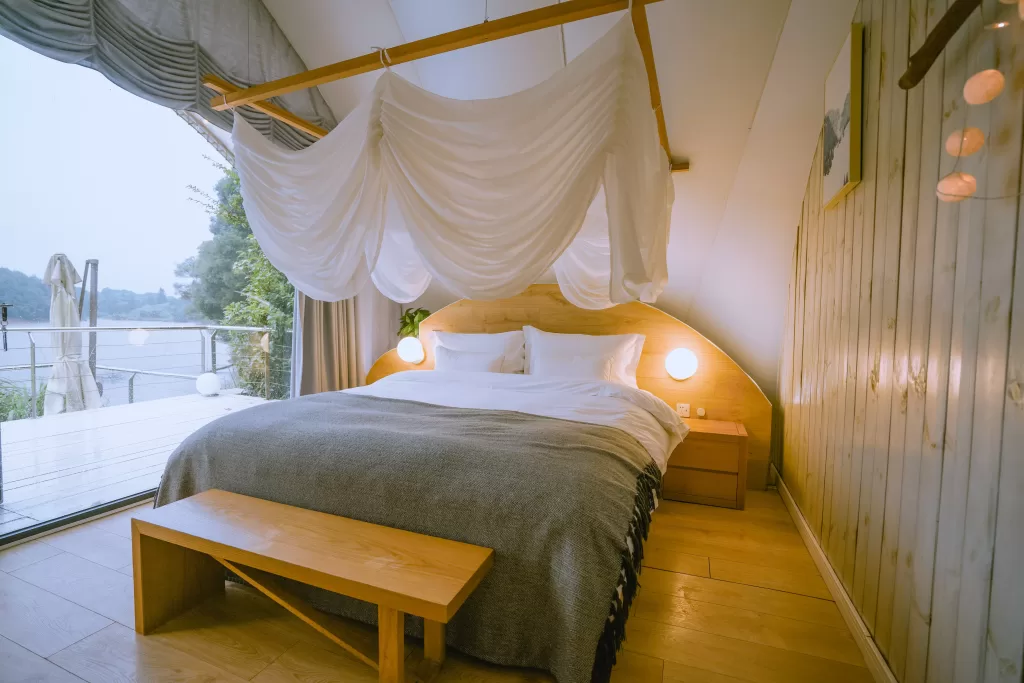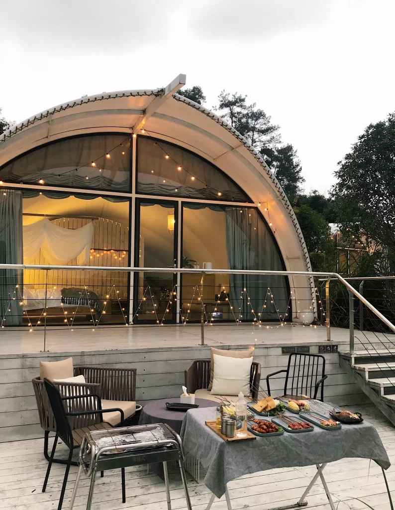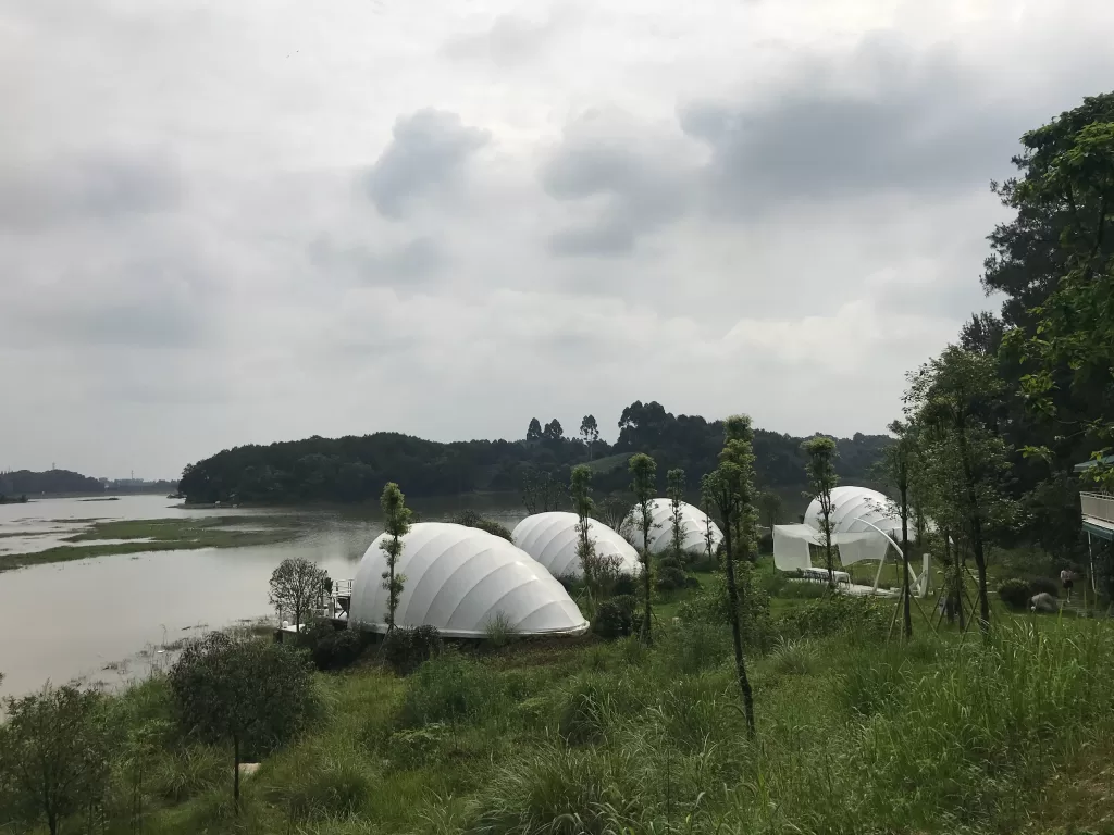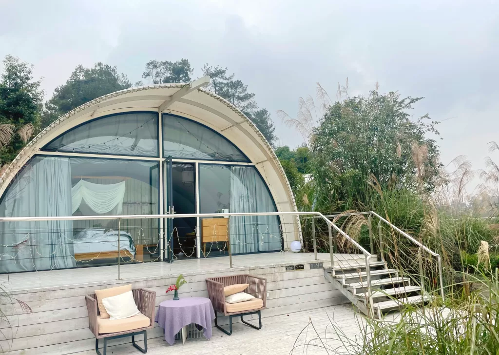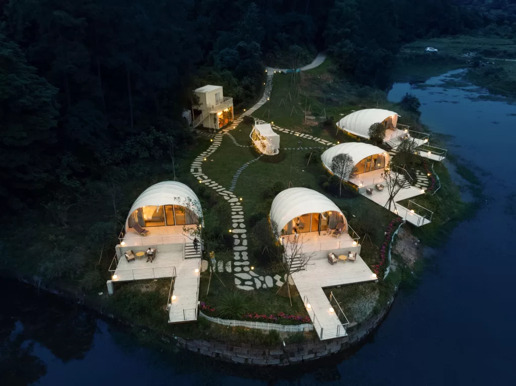 Questo tenda safari deluxe looks like a shell, we called Luxury Tent – Shell. Luxury tent accommodation for 1-2 peoples, located in North of China near the lake. There is a large lake and green grass in front of the glamping pods tent, your guests can enjoy the flowers and picnic to take pictures and record, and watch the sunrise and sunset outside the tent, plus the unique shape of the tent, just enjoy this wonderful time.