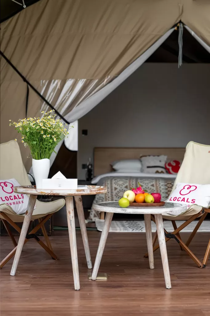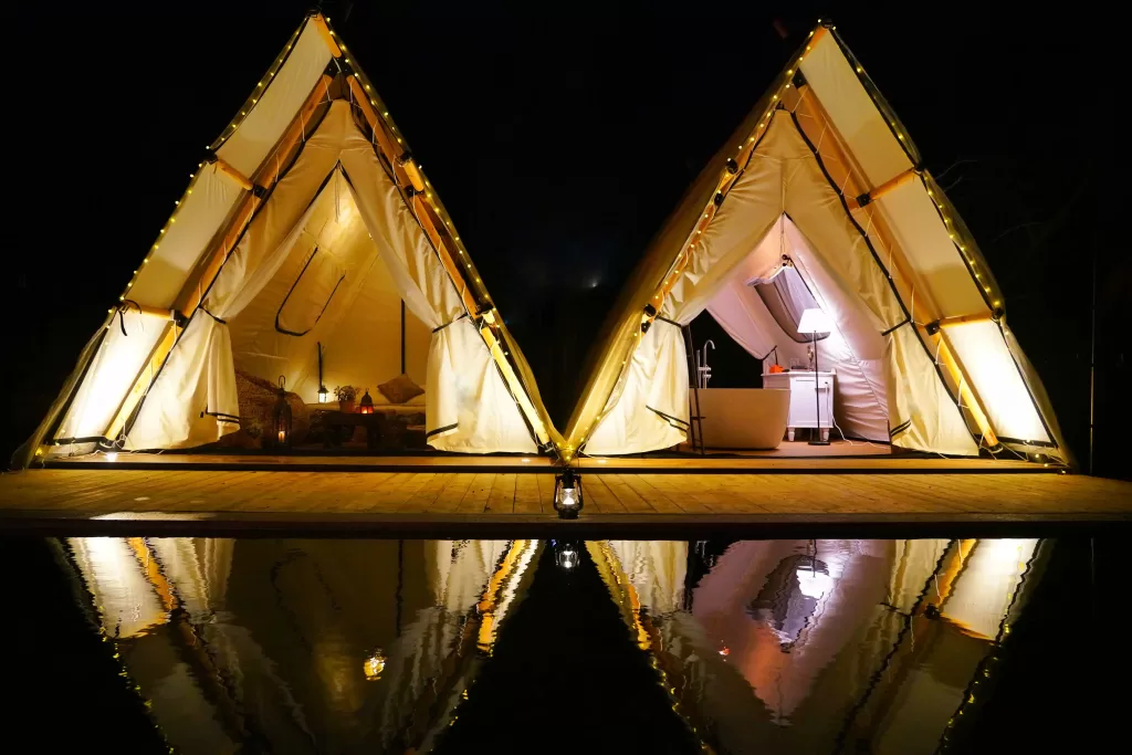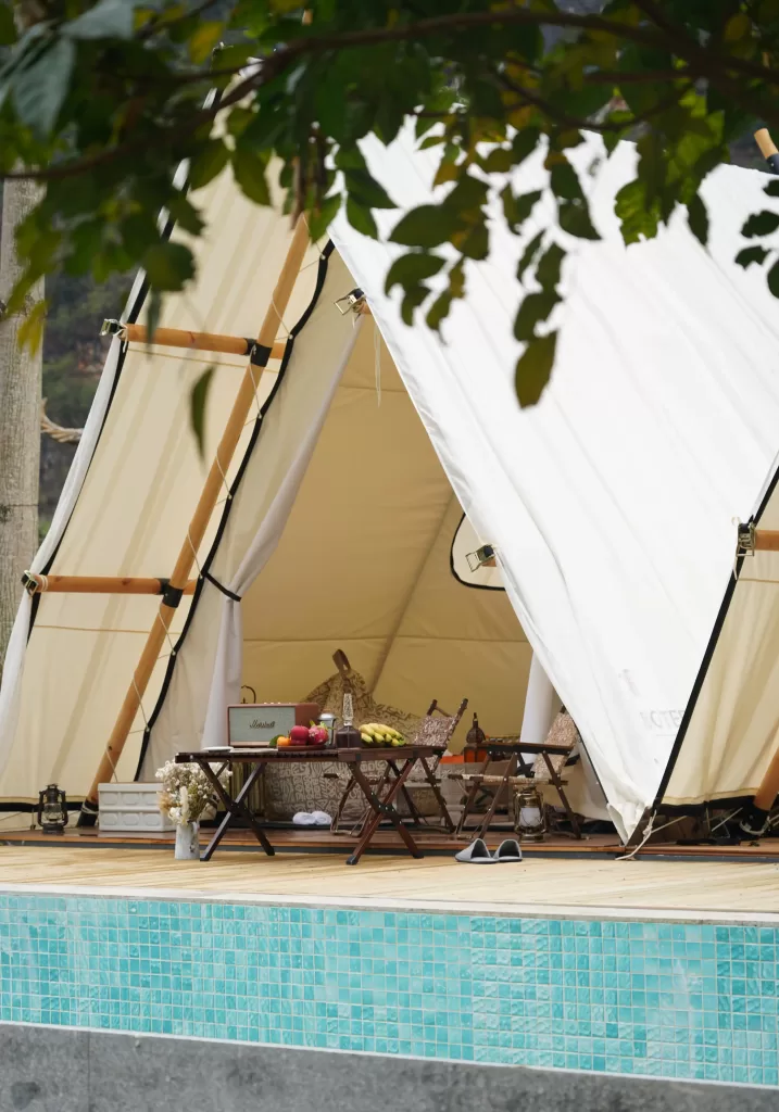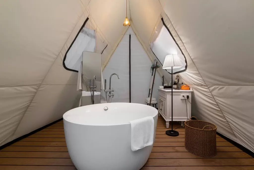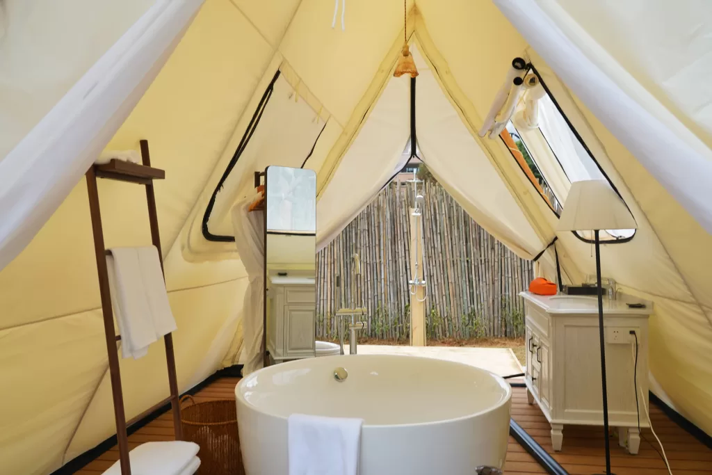 Ce ne sono tre Tenda Safari – Venere, ciascuno di 35 piedi quadrati, con teloni in PVC e oxford impermeabili per creare tende da campeggio in stile tribale africano. La nostra filosofia è la premessa di non sacrificare l'ambiente naturale rurale, vivere in tende safari è più vicino alla natura. IL tenda da campeggio di lusso dispone di acqua, elettricità e di uno spazioso letto matrimoniale. Quando necessario, gli ambienti interni possono prevedere anche il tatami o il pavimento in legno come materasso, per soddisfare le esigenze di riposo dei clienti. Ogni tenda glamping di lusso La posizione offre un balcone di 3x5 m per consentire agli ospiti di avere spazio per rilassarsi. La tenda da campeggio safari dispone di vasche a legna naturali ed ecologiche. Goditi il massimo relax trascorrendo del tempo speciale sotto le stelle con la tua bevanda preferita.