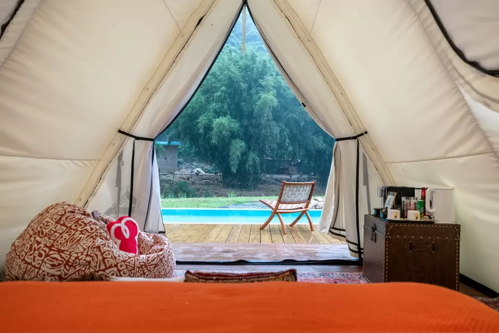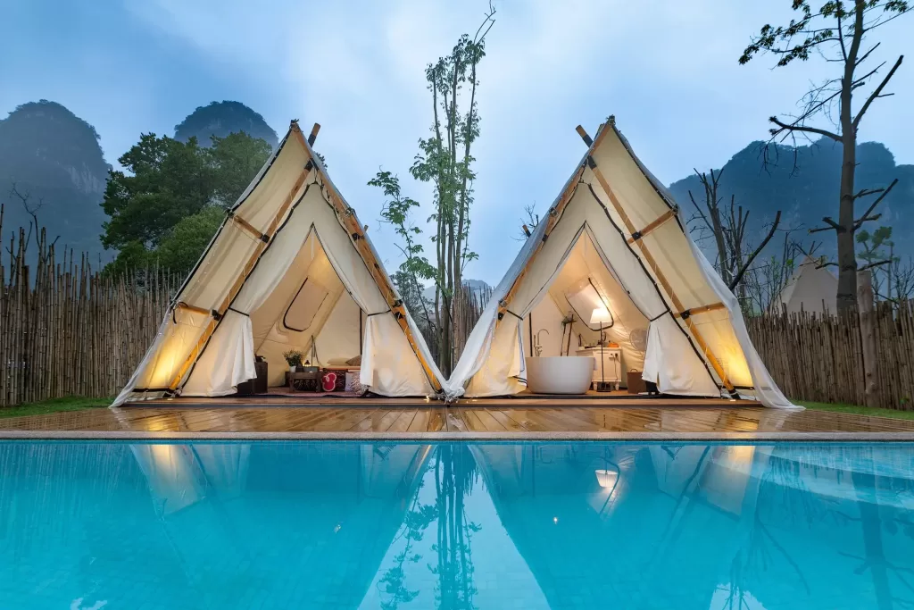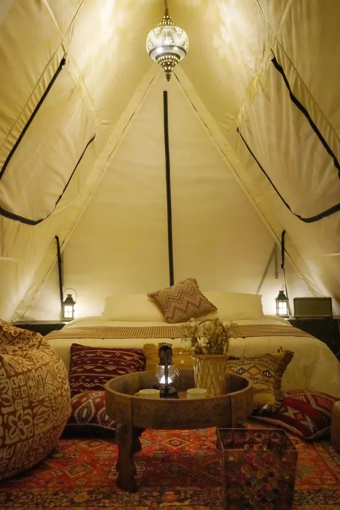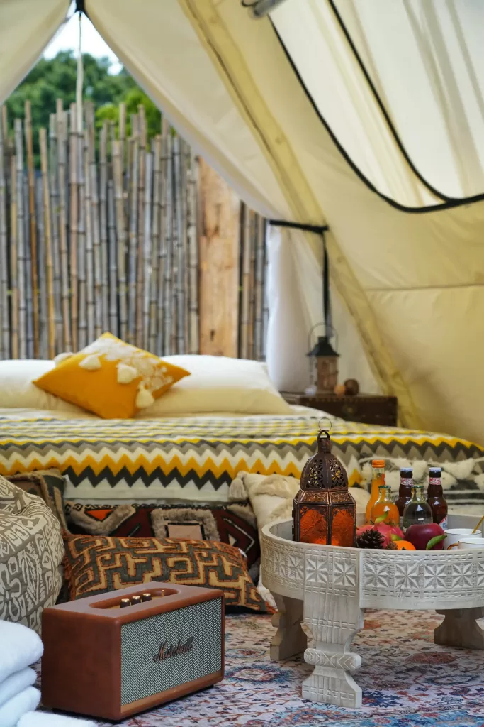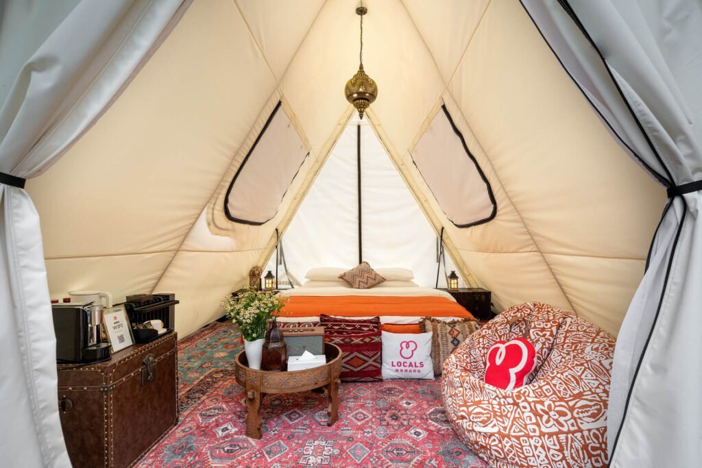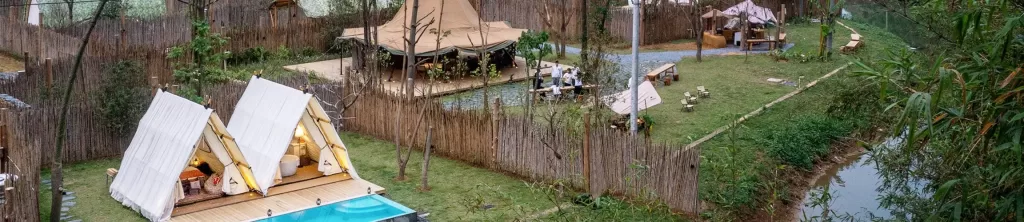 Ce ne sono tre Tenda Safari – Venere, ciascuno di 35 piedi quadrati, con teloni in PVC e oxford impermeabili per creare tende da campeggio in stile tribale africano. La nostra filosofia è la premessa di non sacrificare l'ambiente naturale rurale, vivere in tende safari è più vicino alla natura. IL tenda da campeggio di lusso dispone di acqua, elettricità e di uno spazioso letto matrimoniale. Quando necessario, gli ambienti interni possono prevedere anche il tatami o il pavimento in legno come materasso, per soddisfare le esigenze di riposo dei clienti. Ogni tenda glamping di lusso La posizione offre un balcone di 3x5 m per consentire agli ospiti di avere spazio per rilassarsi. La tenda da campeggio safari dispone di vasche a legna naturali ed ecologiche. Goditi il massimo relax trascorrendo del tempo speciale sotto le stelle con la tua bevanda preferita.