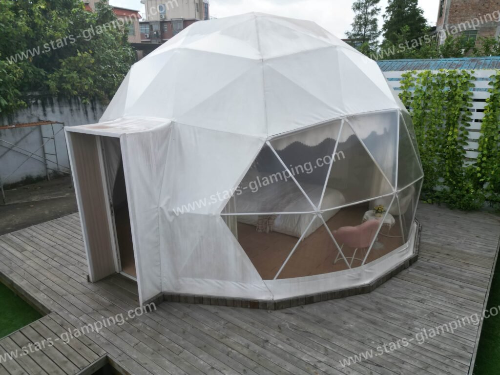 Inside, the Glamping Dome is thoughtfully furnished with a cozy bed, stylish seating, and elegant décor—creating a boutique hotel ambiance in a compact footprint. The wooden deck foundation adds warmth and elevation, making it suitable for a variety of terrains. Whether nestled in the forest, perched on a hillside, or placed near the water, this dome adapts beautifully to its environment.