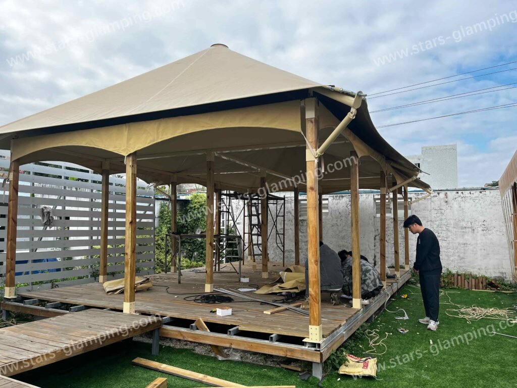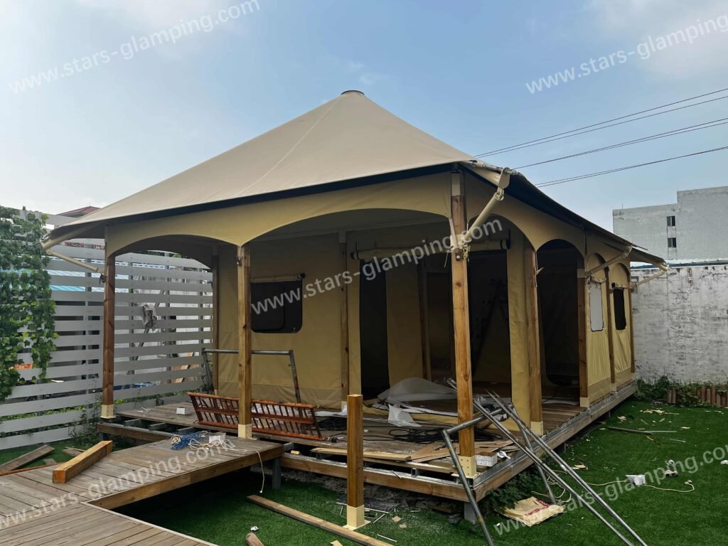 The image captures the tent mid-construction, showcasing its modular framework and hands-on assembly process. This reflects the Aries model’s ease of installation and adaptability to various terrains. As a trusted tent factory, we’ve engineered the Aries tent for long-term durability, using weather-resistant canvas and reinforced structural components that stand up to wind, rain, and sun.
