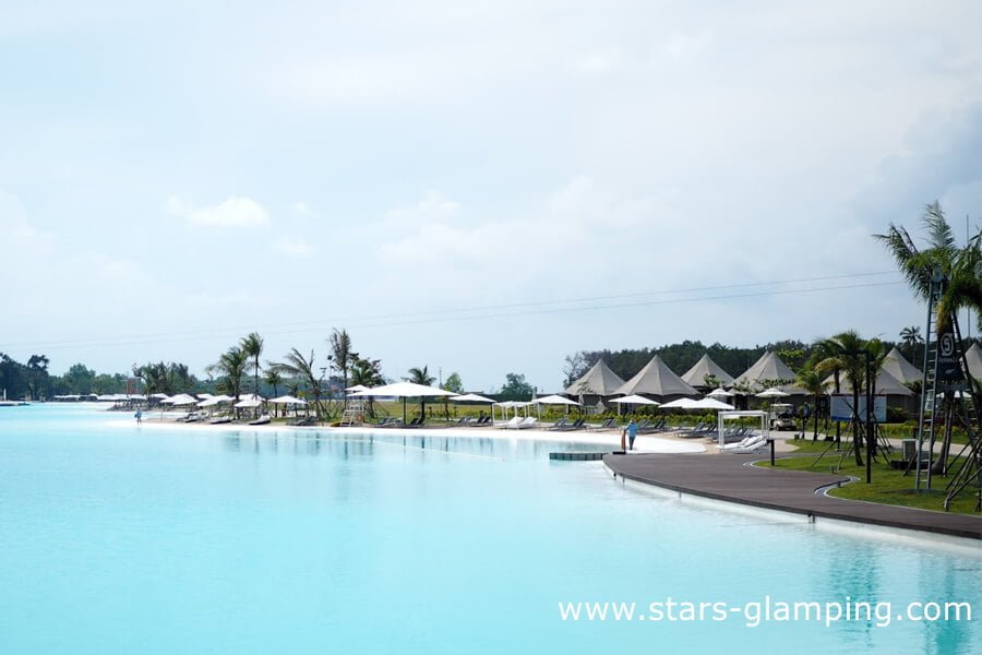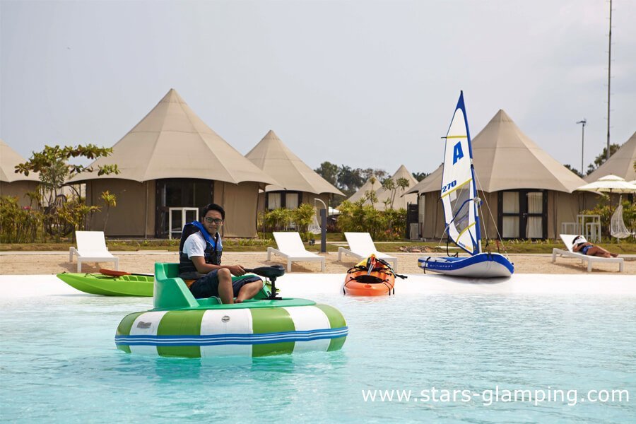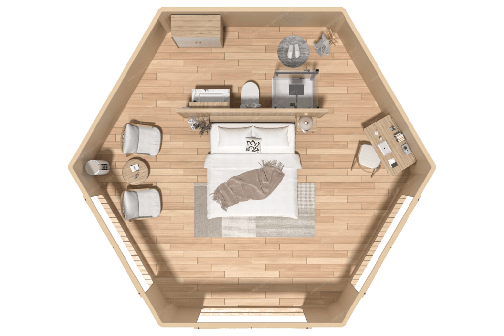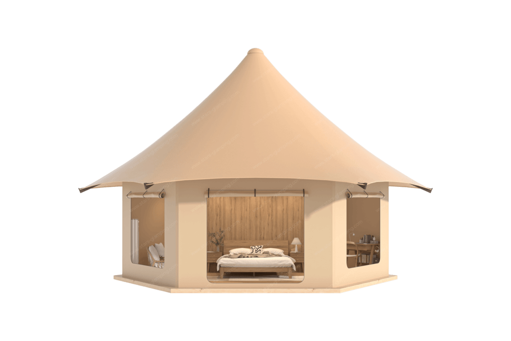 La tenda Glamping Safari è realizzata in tubo di acciaio zincato a caldo 80×80 con finitura a cottura. Utilizzando poliestere rivestito in PVDF da 1050 g/mq come copertura esterna, tessuto Oxford 900D come tela interna. La tenda safari esagonale ha una lunghezza laterale di 3,5 me una superficie interna di circa 32 metri quadrati.