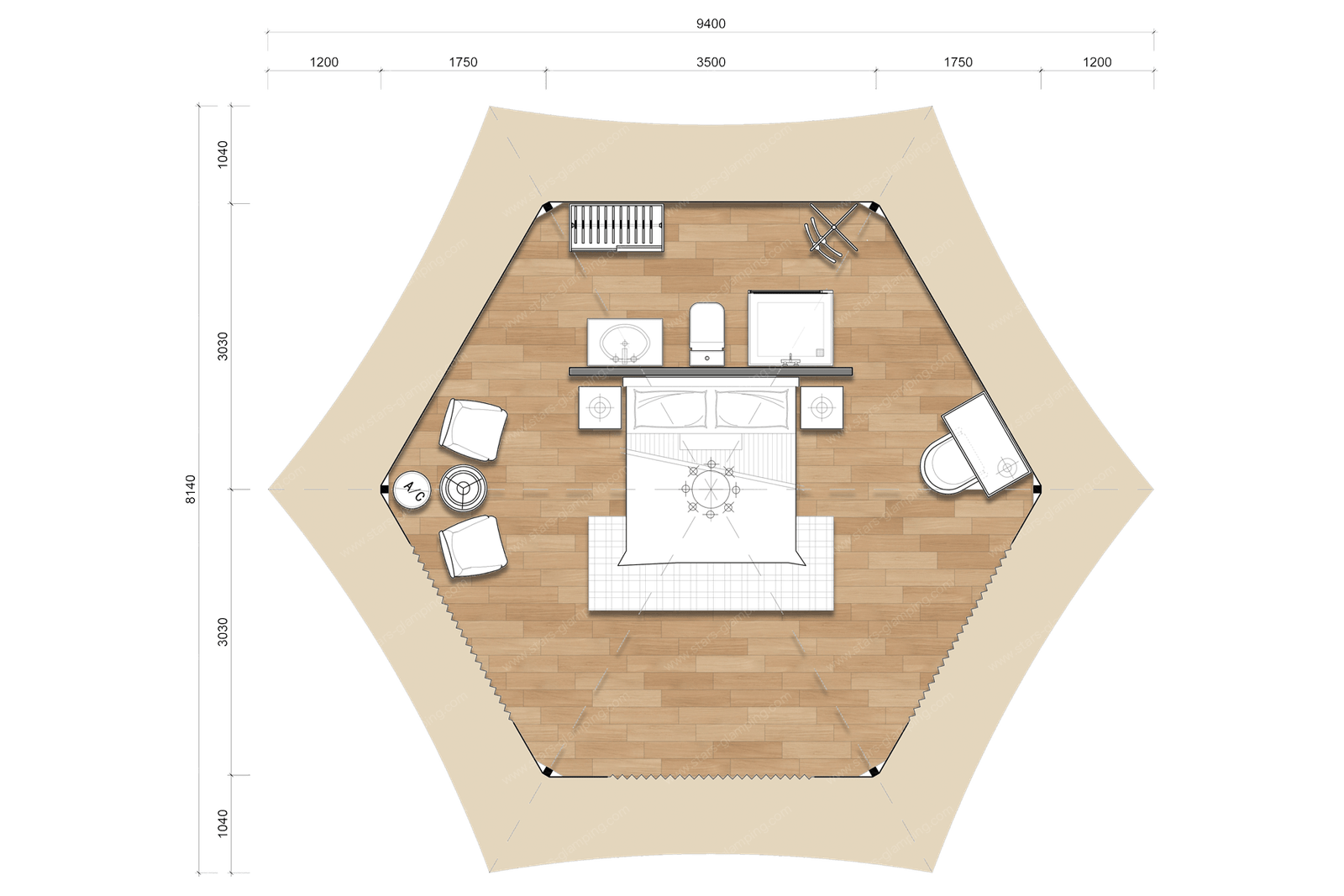 La tenda safari esagonale può essere equipaggiata con tutto ciò di cui ha bisogno un resort di altissima categorizzazione. Cabina armadio, bagno spazioso e completamente attrezzato, zona lounge e moderna cucina modulare collegata alla sala da pranzo. La zona giorno centrale è collegata al terrazzo e offre nel suo insieme una vista mare eccezionale. Possiamo fornire soluzioni personalizzate in base alle vostre esigenze.