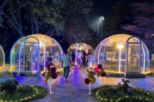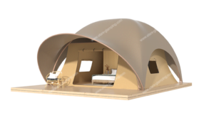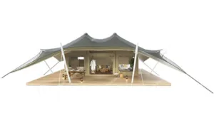 Stars Glamping borrowed this style and used wood and canvas to create a luxury Safari Tent – Teepee with a primitive style. The semi-circular khaki canvas and log structure reveal a simplicity, restoring the original as much as possible.
