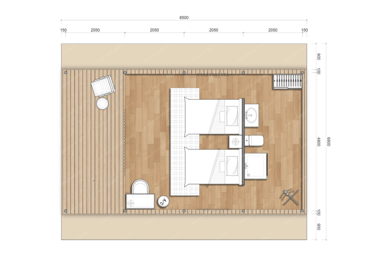 Lodestar - tenda de safári de luxo tem cobertura externa com cada metro quadrado de tecido de poliéster revestido de PVC de 850g cujo material não é apenas à prova d'água, mas também retardador de fogo para proteger todo o conjunto da barraca. E a capa interna com tecido Oxford 900D também deixa o interior e o exterior da barraca lindos, esse material também potencializa o efeito impermeável da barraca safari, o que é especialmente prático em países com muitas estações chuvosas.