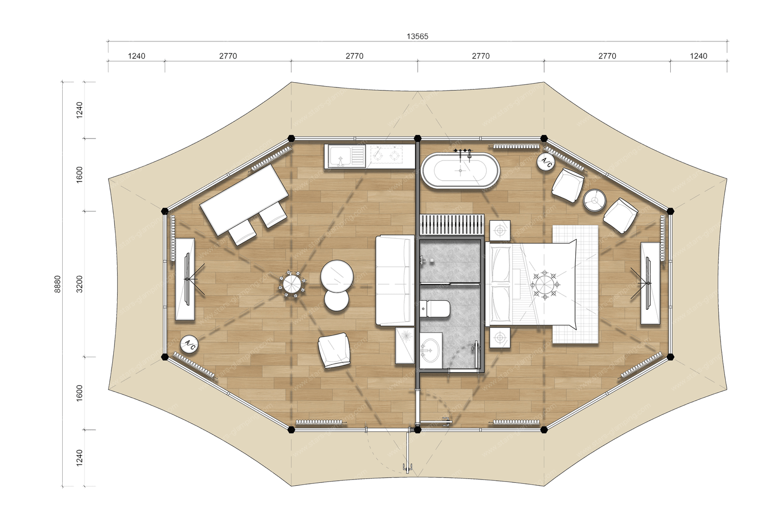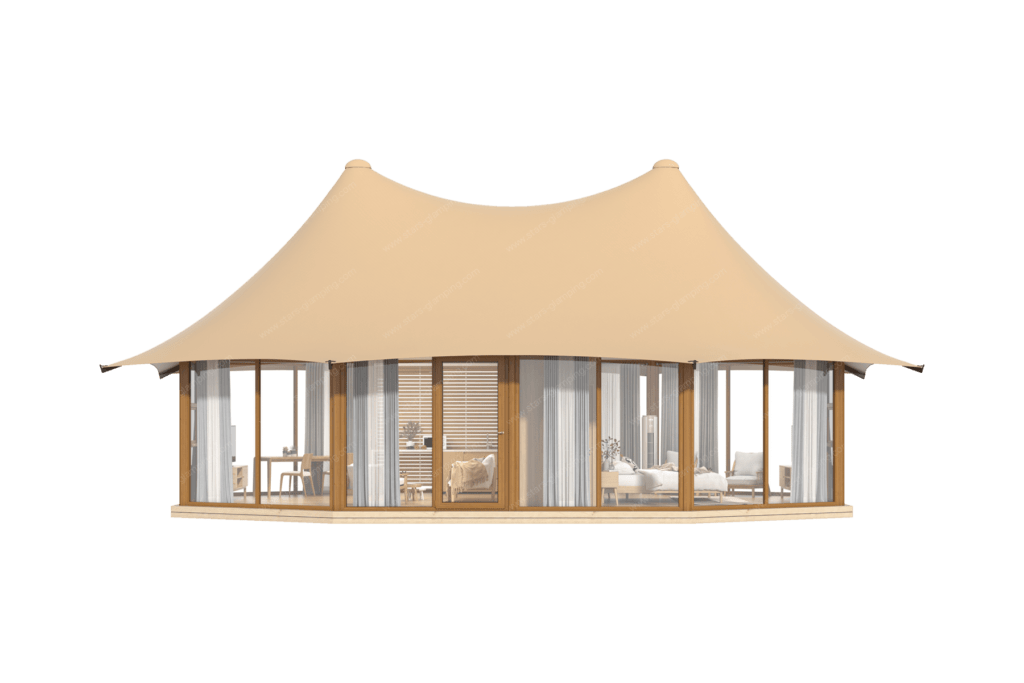 Tenda de Luxo - Gemini também chamada de tenda glamping de duplo repique, como o nome indica, o topo da tenda utiliza o design de formato frontal duplo, cheio de estilo africano moderno e elegante. Tendo como pano de fundo a natureza é como estar numa villa de luxo no campo, mais importante ainda, o interior da tenda glamping Luxury – Gemini do que a tenda convencional do hotel tem um aproveitamento de espaço maior, o aproveitamento do campo será mais extenso, a utilização de áreas será mais ampla, tais como: glamping paisagístico, alojamento em hotéis, atividades ao ar livre, festas, locais de lazer e entretenimento, restauração especial, etc.