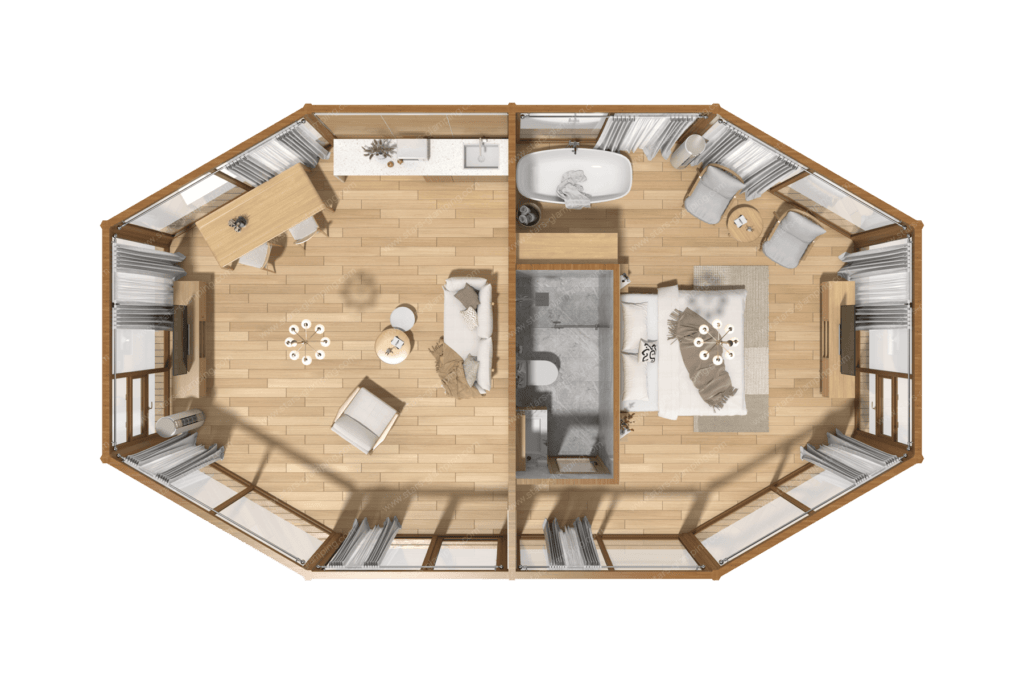 Para estar mais integrada no ambiente envolvente, a glamping Luxury Tent – Gemini's cobertura exterior pode ser pintada com spray com uma variedade de cores e padrões para desenhar um tema diferente do hotel, e tem um chão totalmente transparente. opções de parede de vidro no teto, tanto em ambientes internos quanto externos, com toda a vista na parte inferior. A glamping Tenda Luxo - A decoração interior do Gemini pode ser combinada com uma variedade de acessórios como móveis, eletrodomésticos, roupas de cama, iluminação, banheiro, tapetes, cortinas luxuosas, etc., para criar um ambiente interior romântico e acolhedor.