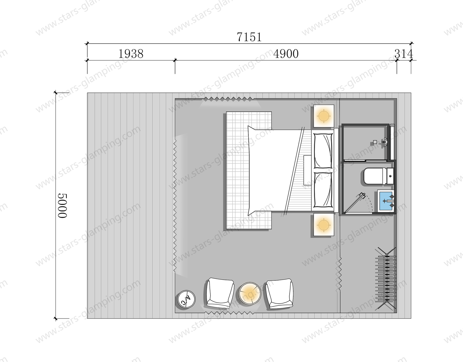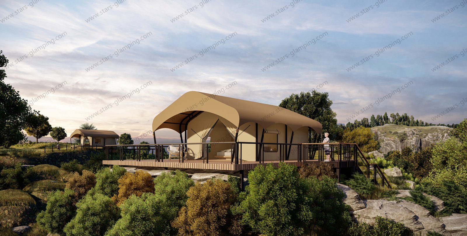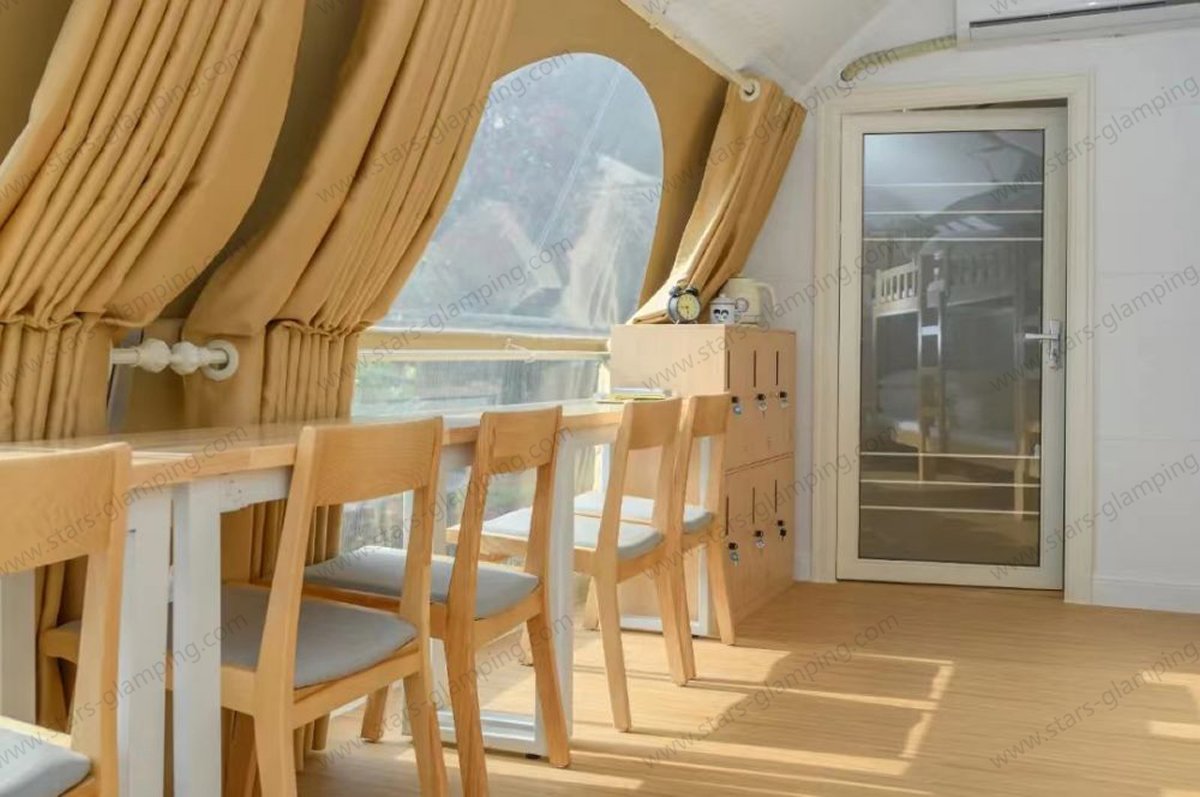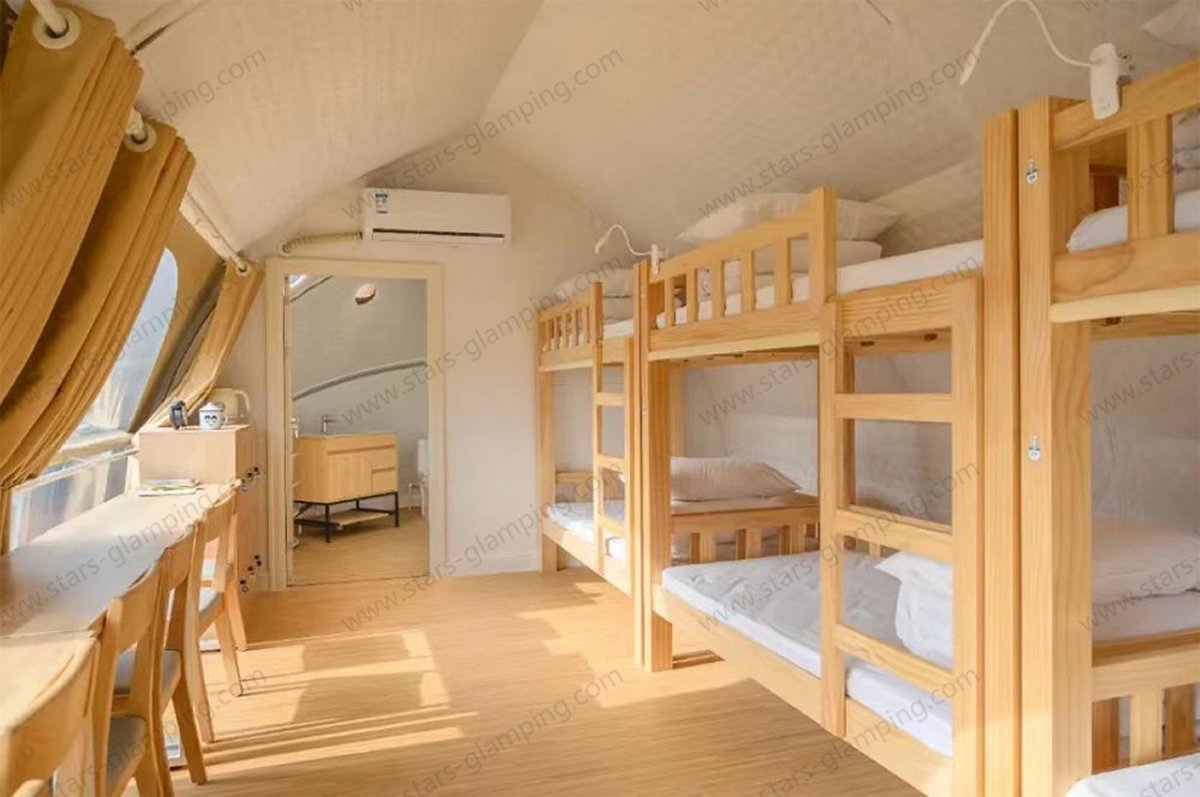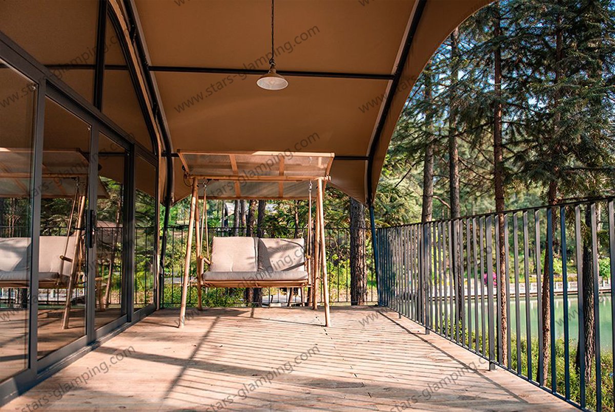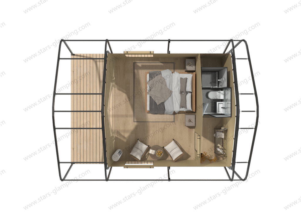 Inside, the spacious layout allows for flexible configurations, including a private bedroom and a bathroom, making it ideal for luxury campsites, eco-lodges, and family retreats. The structure is both strong and stable, ensuring safety in various weather conditions. What’s more, the size of the tent can be customized based on your site requirements, offering greater flexibility for different land sizes and layouts. Whether you are building a glamping resort or a nature retreat, the Safari Tent – Army offers a perfect balance between rugged performance and modern comfort, seamlessly integrating with the beauty of the natural world.