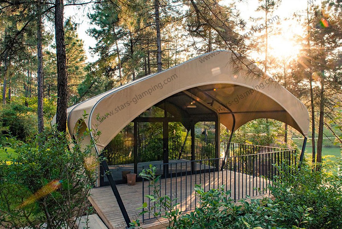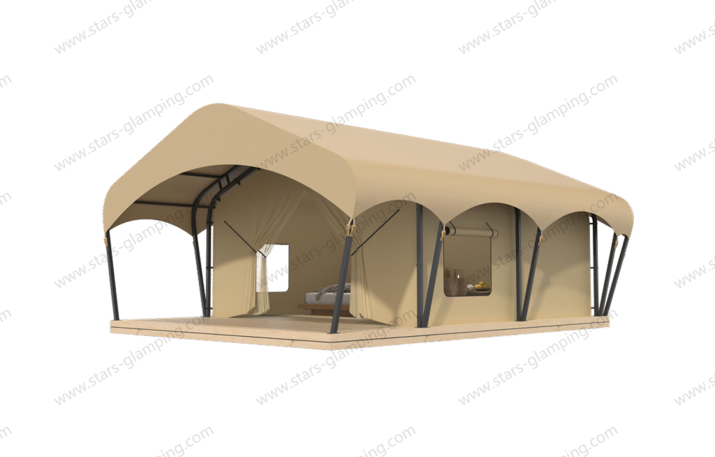 The Safari Tent – Army is a premium glamping tent that combines durability, functionality, and natural aesthetics in one unique design. Its eye-catching arched roof structure is not only visually appealing but also blends harmoniously with outdoor environments such as forests, grasslands, deserts, or lakesides.