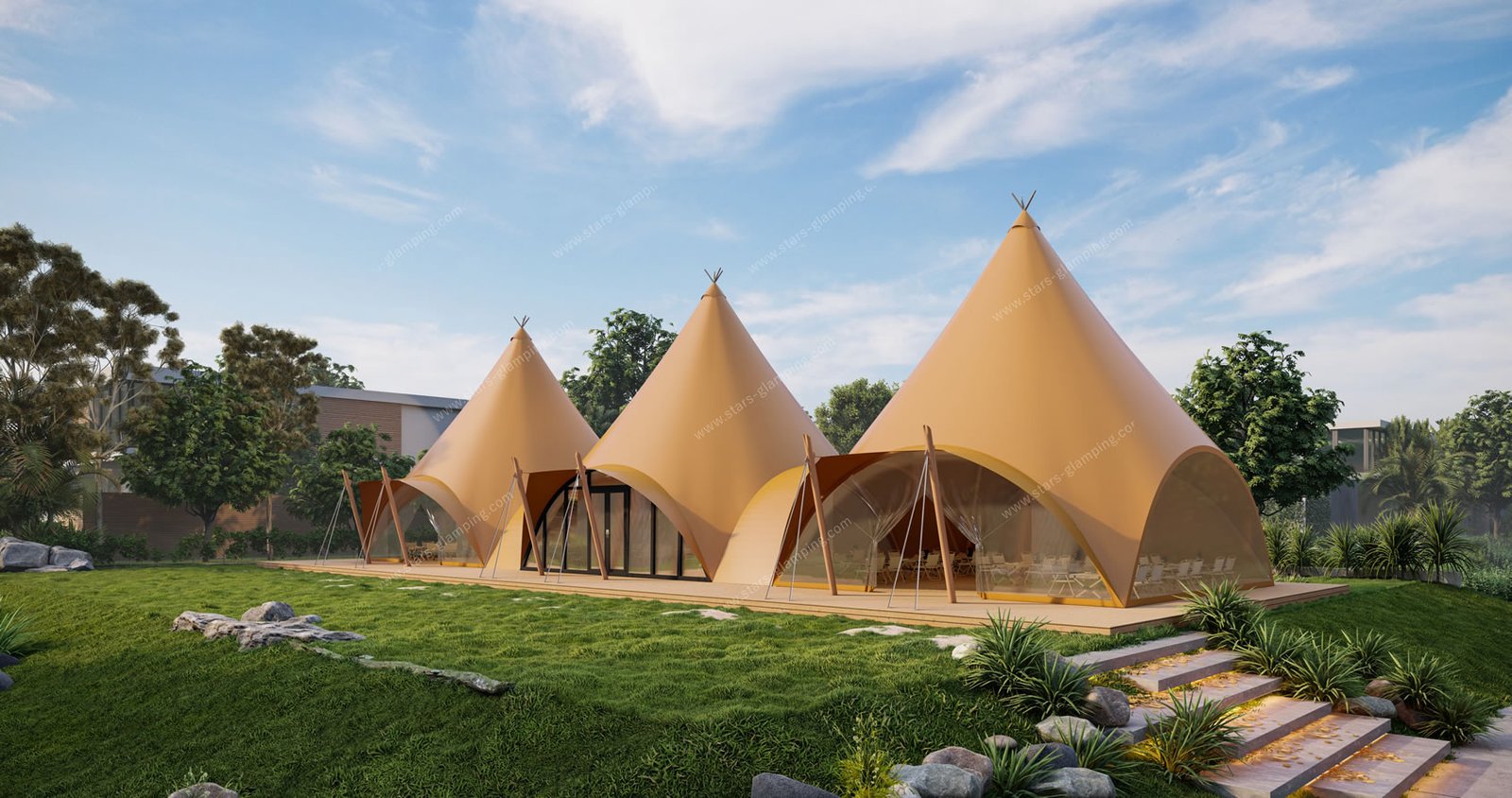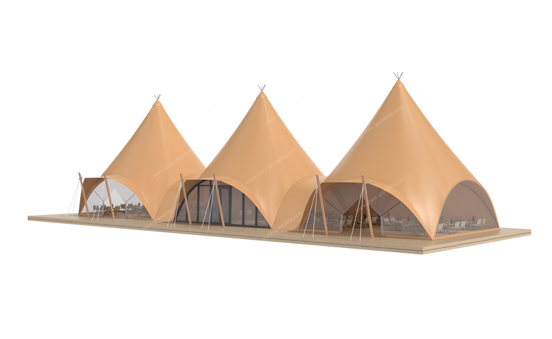 The Safari Tent – Pyramid is designed as a landmark reception and hospitality space for luxury resorts, eco-hotels, and glamping destinations. Its distinctive connected pyramid structure, inspired by traditional tipis, creates an iconic silhouette that instantly elevates the landscape and adds character to any property.