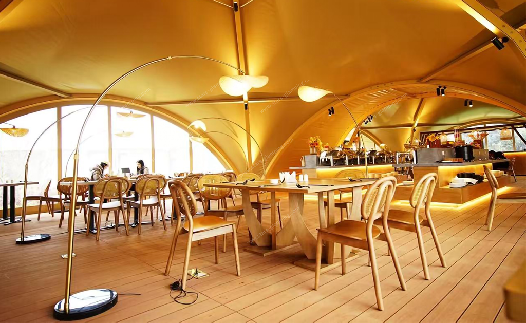 Engineered with a galvanized steel pipe frame and covered in architectural-grade PVDF membrane fabric, the Pyramid Tent offers exceptional strength, weather resistance, and long-term durability. The membrane surface provides elegant light diffusion, giving the interior a soft daylight glow and a warm, atmospheric ambiance at night.