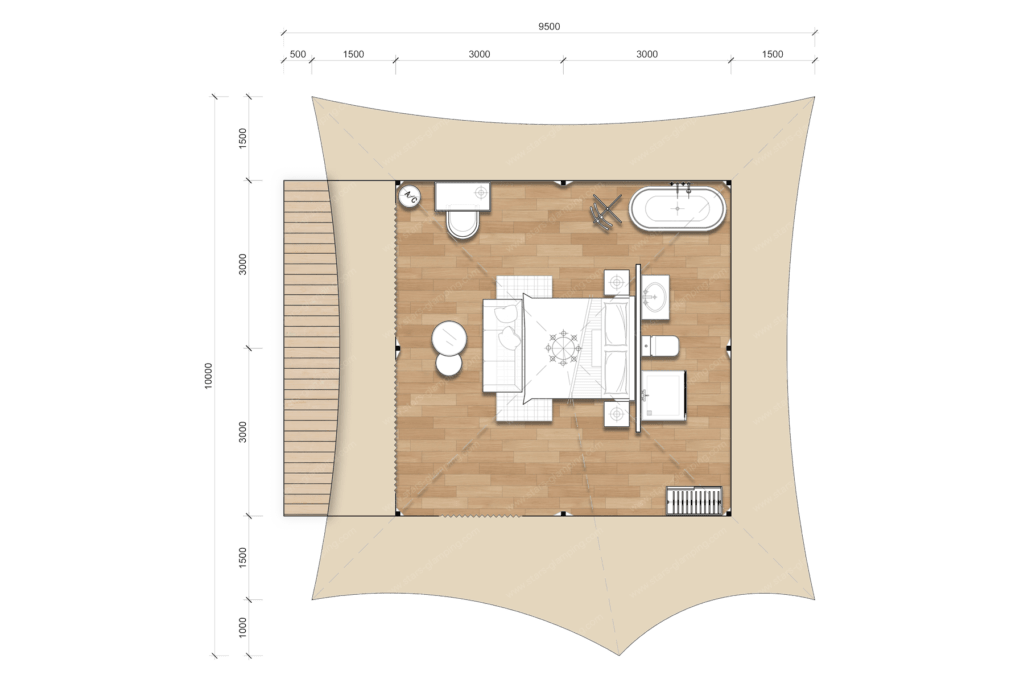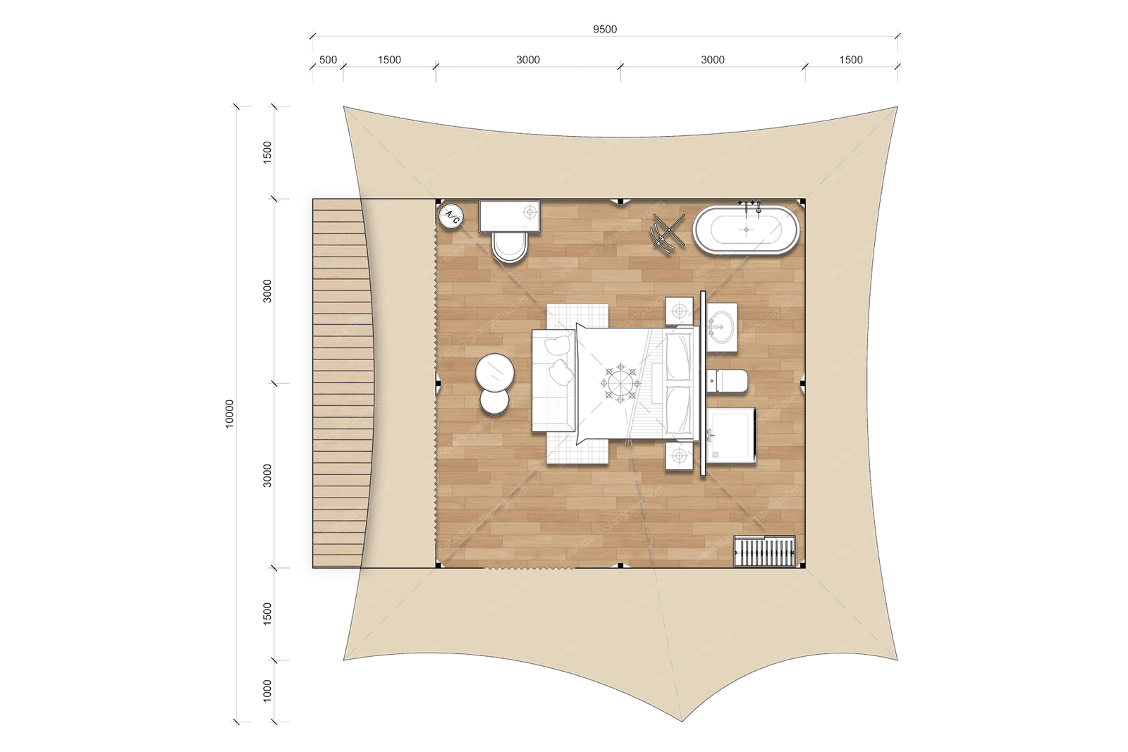 Compared to ordinary camping, Square – Safari Tent outdoors is more enjoyable. Our square safari tent is made by 80x80mm galvanized steel frame. The material of outer cover is 1050g/sm PVDF, with a service life of up to 20 years, has high-quality UV protection and sun shading ability. Because of extremely strong stainless steel material and waterproof PVDF fabric for cover, glamping safari tent does well in fire-resistance, heat preservation, waterproof and wind resistance.